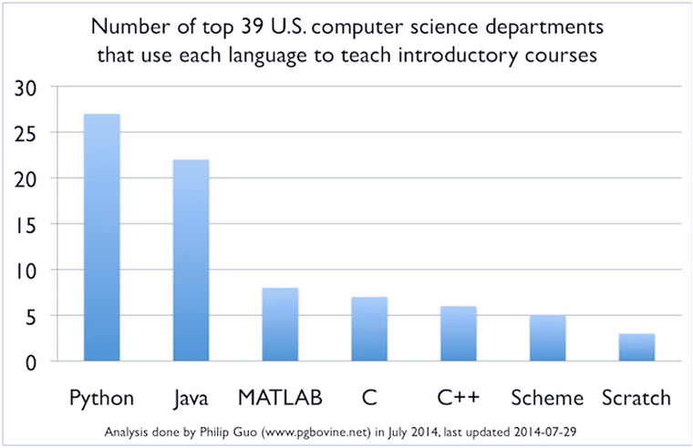 В высших учебных заведениях в США на вводных курсах Computer Science часто преподают Python. По данным исследования Ассоциации Вычислительной Техники 2014 года, этот язык выбрали 27 из 39 лучших американских университетов. На это есть несколько причин: