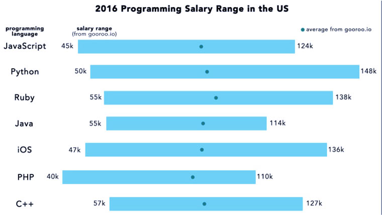 По данным американского портала gooroo.io, самый высокий «потолок зарплат» среди разработчиков на популярных языках у программистов Python. Максимальное годовое вознаграждение, указанное в вакансиях, составляет 148 тысяч долларов.