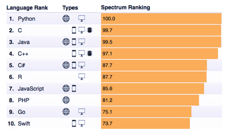 По данным ежегодного рейтинга журнала IEEE Spectrum, Python на первом месте по популярности среди языков программирования. Для составления рейтинга журналисты анализировали публичные чаты разработчиков, объявления о вакансиях, Github, StackOverflow и десятки других источников.