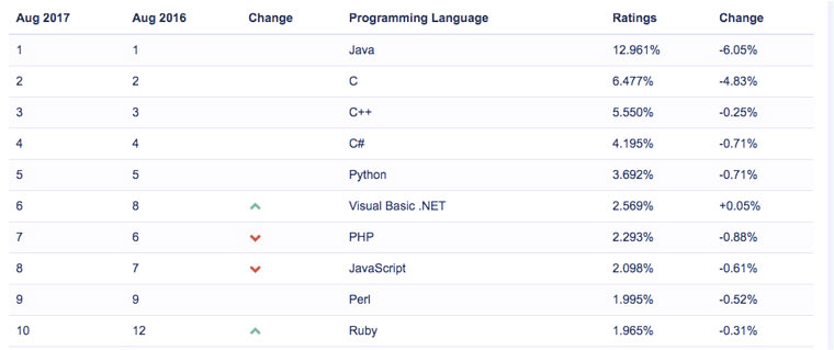В августе 2017 года Python был на пятом месте в рейтинге Tiobe Index. Он составляется на основе результатов запросов вида »<название языка> programming» в популярных поисковиках.