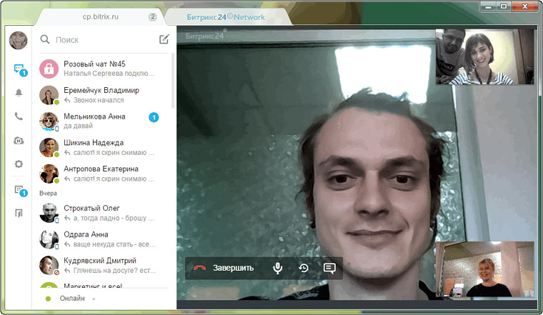 Здорово, что голосовые звонки внутри Битрикс24 бесплатные, плюс можно создавать видеоконференции с участием до 4 человек. Можно демонстрировать экран компьютера и перекидывать файлы участникам, в общем, всё по высшему разряду.