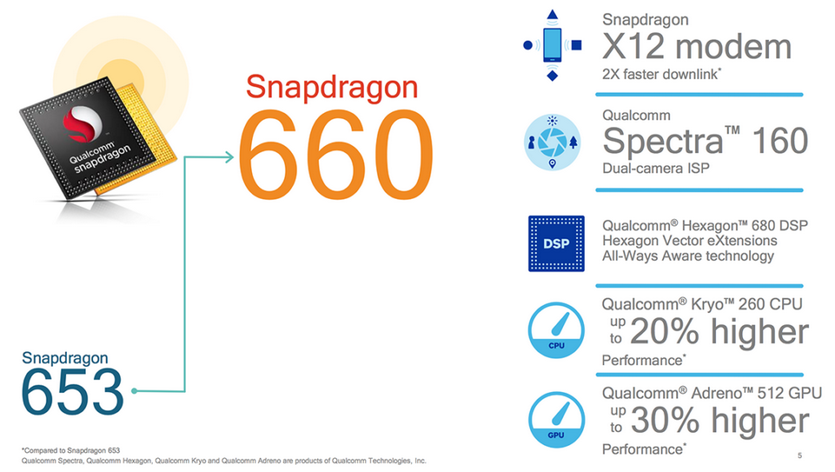 Первой неожиданностью стали процессоры новинок. Вместо ожидаемых бюджетных процессоров Redmi использовала… прошлогодние среднеценовые, точнее — именно предтоповые: именно так можно назвать однокристальную платформу Snapdragon 660.