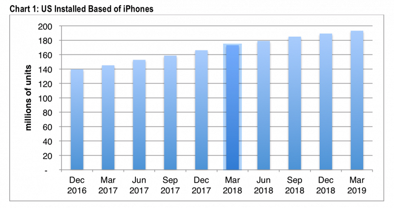 Ссылаясь на данные аналитиков CIRP, источник говорит о том, что количество пользователей смартфонов iPhone в США по итогам первого квартала текущего года составило 193 млн человек. Это на 2% больше, чем кварталом ранее, и на 12% превышает показатель годичной давности.