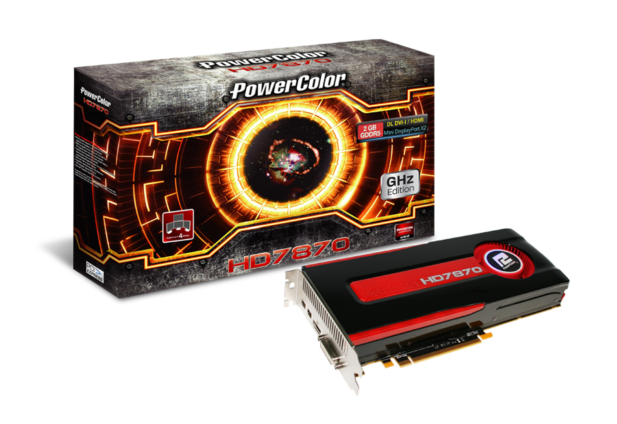 Компания TUL Corporation, являющаяся владельцем бренда PowerColor, официально представила собственные разработки на основе адаптеров серии AMD Radeon HD 7800, о чьей презентации мы недавно писали. В число новинок от тайваньского производителя вошли модели PowerColor PCS+ HD7870 GHz Edition, PowerColor HD7870 GHz Edition и PowerColor HD7850, причем, первая из них снабжена фабричным разгоном до 1100 и 1225 (4900) МГц для GPU и памяти, а две остальные работают на стоковых частотах.