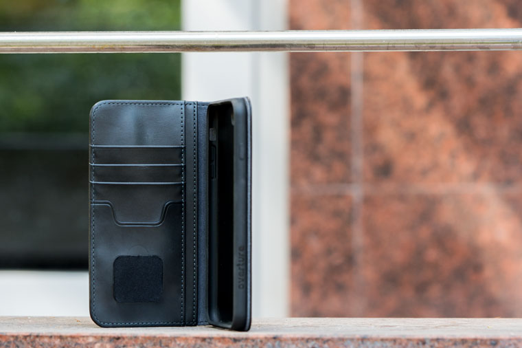 Если держать телефон в правой руке, то часть чехла с карточками будет как раз во рту. Левой вообще неудобно брать, потому что большой палец не может никак за него ухватиться.