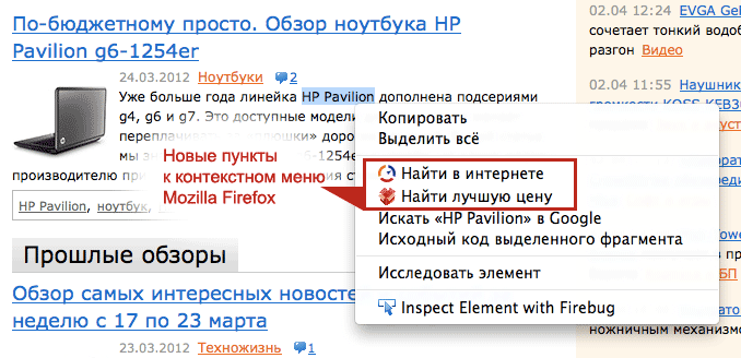 После окончания установки вас попросят перезапустить Mozilla Firefox. В результате дополнительные элементы в контекстном меню вашего браузера позволят в два клика выполнить поиск товаров и цен на них, используя сервис Price.ru или поиск в интернете c помощью Rambler.