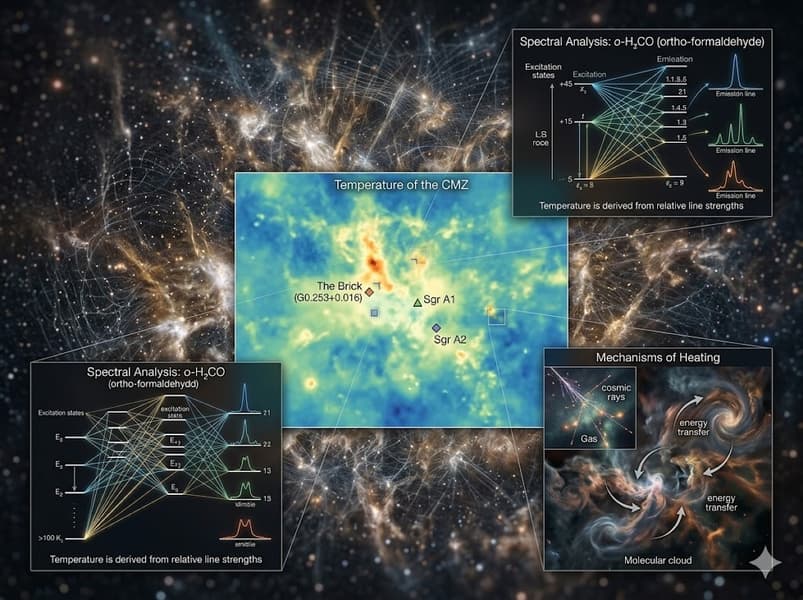 Центральная молекулярная зона представляет собой уникальную область с высокими объёмными плотностями газа, сверхзвуковой турбулентностью (числа Маха > 10), сильными магнитными полями (< 1 мГс) и аномально высоким уровнем космических лучей. Эти условия делают CMZ своеобразной «лабораторией для изучения физики межзвёздной среды». Однако точное определение температуры газа в этом регионе осложнено: наблюдаемые температуры газа значительно превышают температуру пыли, что требует анализа механизмов нагрева, не связанных с фотодесорбцией или радиационным воздействием звёзд.
