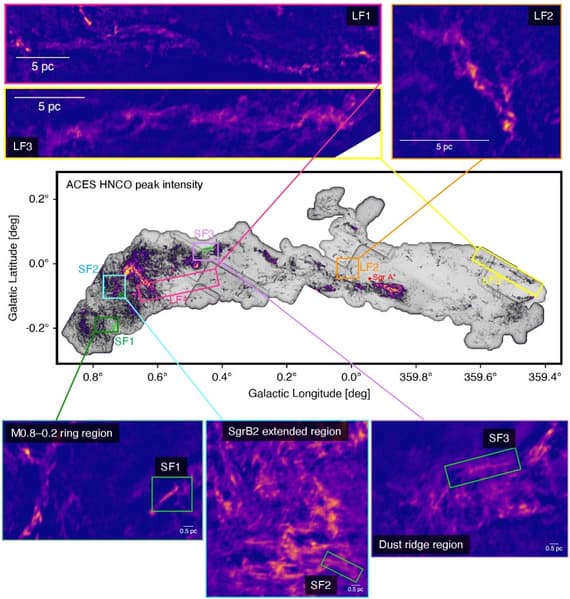 Новый крупный проект радиоинтерферометра ALMA под названием ACES (ALMA CMZ Exploration Survey) позволил впервые составить высокодетальные карты распределения молекулярного газа в этой области. Разрешение наблюдений настолько высокое, что учёные смогли рассмотреть структуру газа на масштабах от десятков парсек до десятых долей парсека — то есть вплоть до размеров отдельных плотных газовых нитей.
