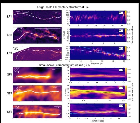 Сравнение морфологии трёх крупных и трёх малых филаментов. Они демонстрируют как сходство — протяжённые нитевидные структуры, согласованные в координатах «положение–скорость–скорость по лучу зрения», — так и различия, прежде всего в масштабах. На правых панелях представлены диаграммы «положение–скорость» (PV), построенные вдоль осей филаментов. Они показывают, что структуры остаются в основном кинематически связными. На левых изображениях показаны карты интегральной интенсивности. В левом верхнем углу каждого изображения указан угол между осью филамента и плоскостью Галактики. Белые звёздочки отмечают точку, от которой начинается построение PV-диаграммы на правых панелях. Малые филаменты демонстрируют непрерывную кинематическую структуру на своей небольшой длине, тогда как у крупных филаментов на масштабах более 10 парсек заметны небольшие разрывы в распределении скоростей (особенно у LF1 в центральной части).Источник: arXiv:2602.20262