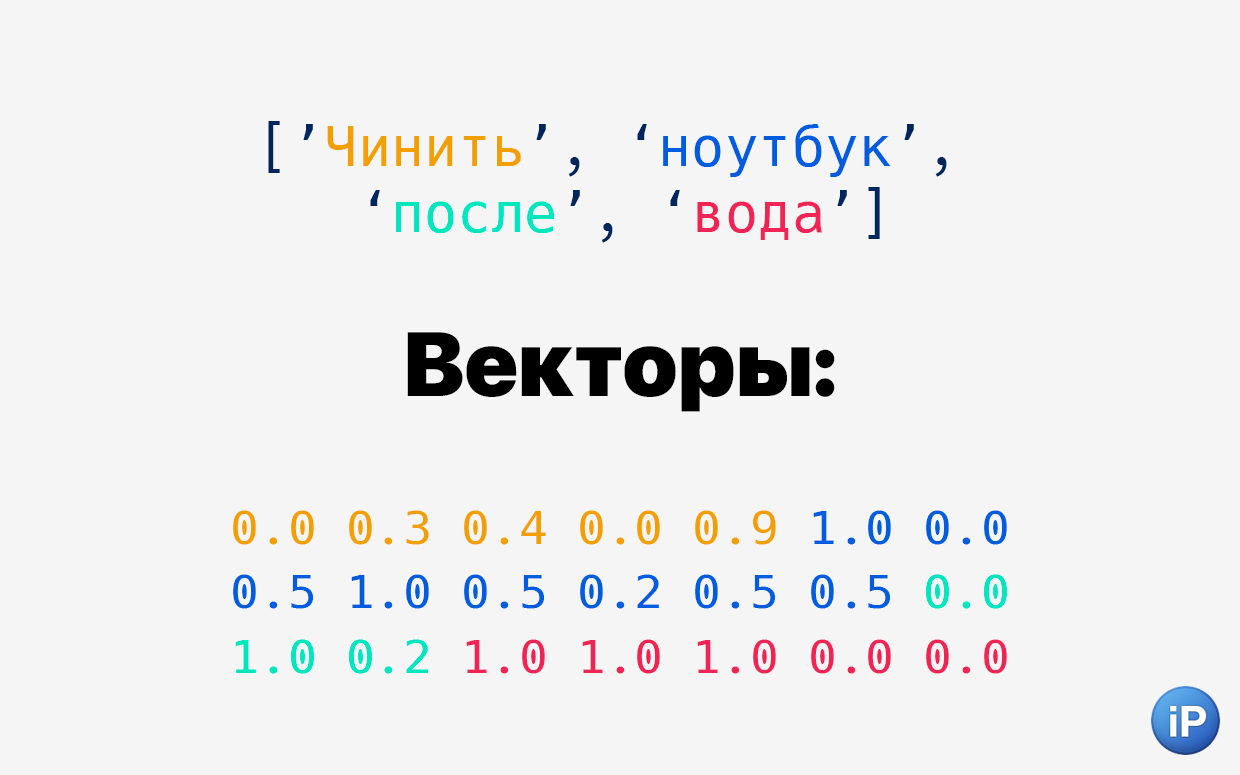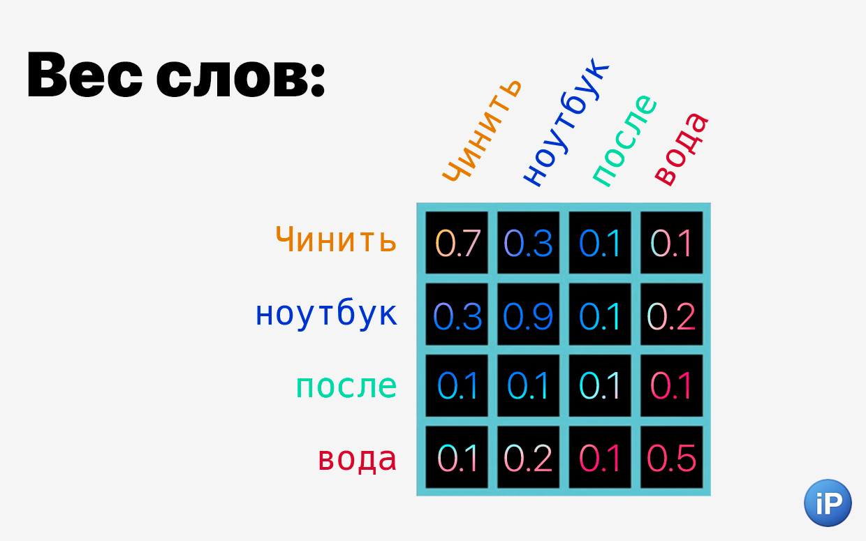 я > 0,1 люблю > 0,3 играть > 0,5 в > 0,2 футбол > 0,8 в > 0,2 парке > 0,9 это > 0,1 моё > 0,2 любимое > 0,8 занятие > 0,7.Числа показывают значимость каждого слова в разговоре. Модель определила, что «футбол», «парк», «любимое» и «занятие» несут в себе больше всего смысла.
