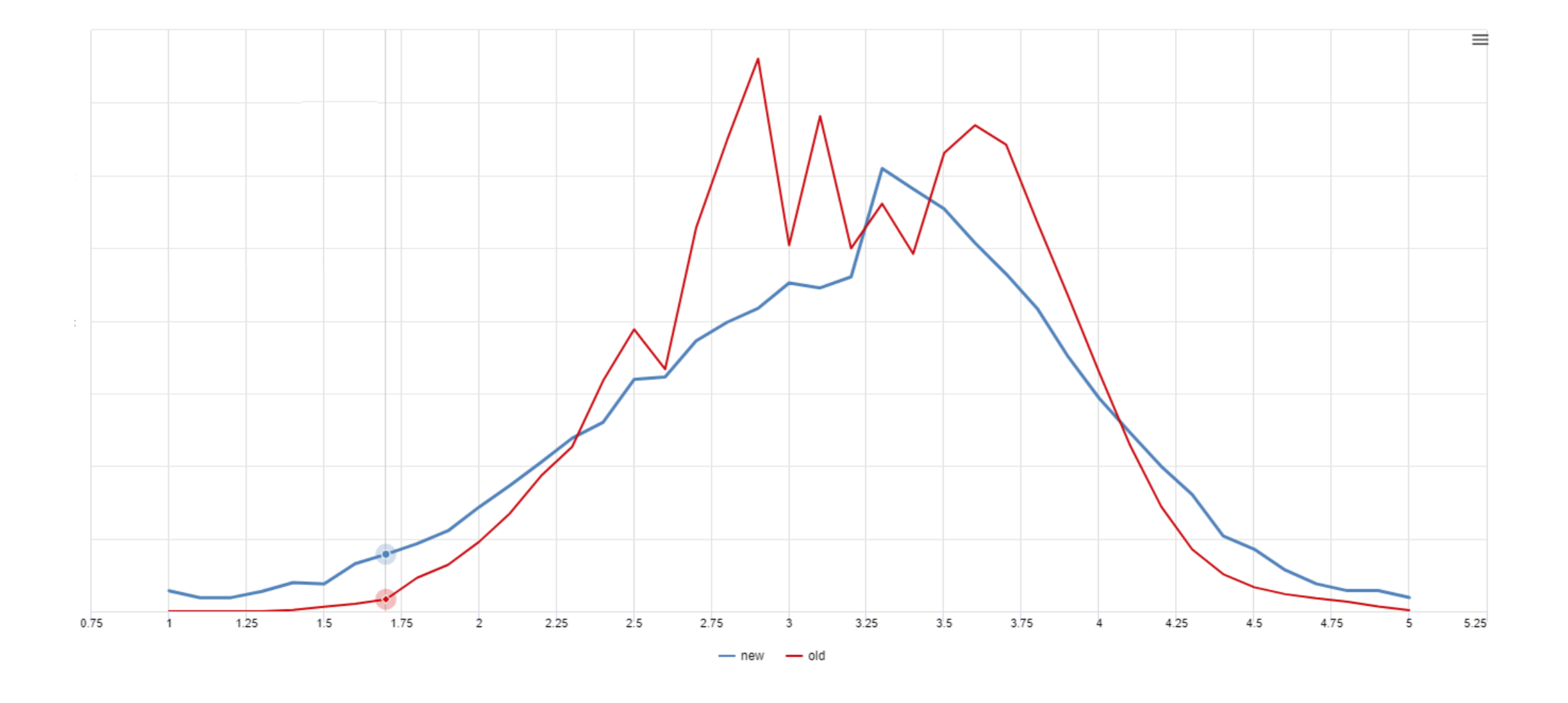 Новое распределение оценок выглядит так (синее — новый рейтинг, красное — старый рейтинг):