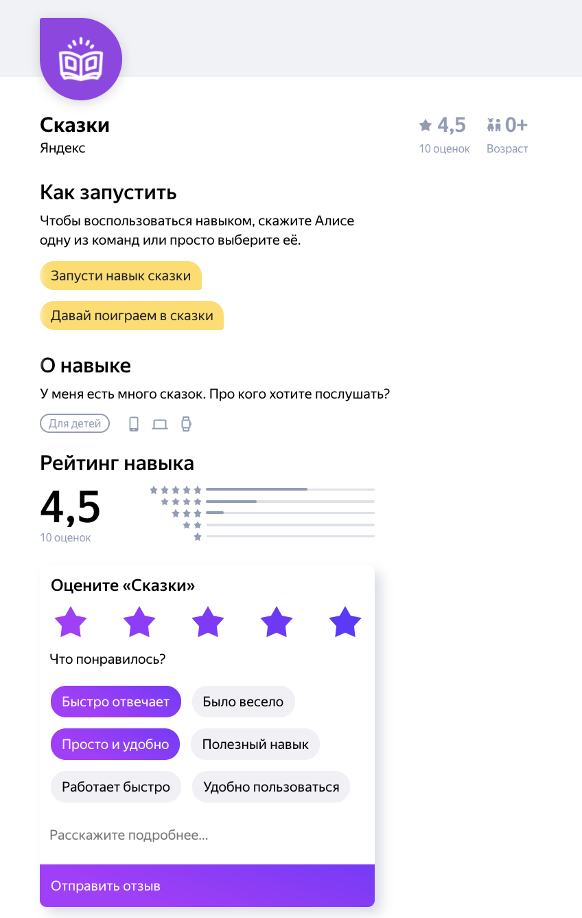 Мы продолжаем серию планомерных улучшений в каталоге навыков Алисы. В этот раз хотим вам представить систему рейтингов: теперь каждый пользователь сможет оценить навык, которым воспользовался.