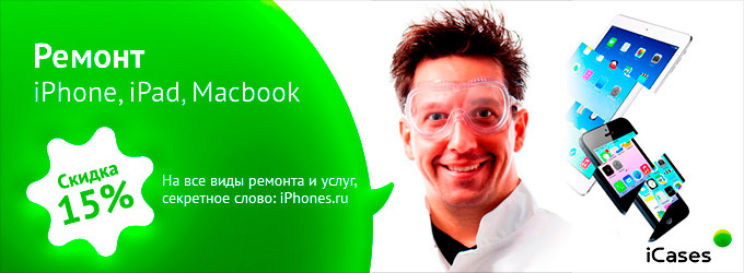 Специально всех читателей нашего сайта iCases решили подарить глобальную скидку на все ремонтные работы с техникой Apple. Просто запомните кодовое слово: iPhones.ru. Скажите его при передаче устройства в ремонт, и получите 15% скидку на итоговую стоимость работ!