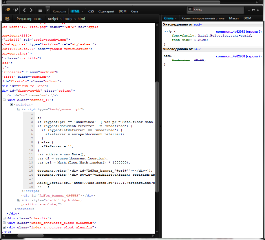 Код главной страницы RIA.ru, использующийся для загрузки дополнительного контента с AdFox.ru