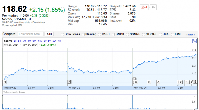Закрывшиеся торги показали новый рекорд — за одну акцию Apple теперь дают 118,62 долларов. Таким образом, общая капитализация компании выросла до $684,06 миллиардов. Для сравнения, капитализация Microsoft на сегодняшний день составляет 394,17 миллиарда долларов. У Google немного меньше — $368,13 миллиардов. Правда, стоит отметить ещё раз то, что цена акции не является прямым показателем капитализации, поскольку стоимость одной акции MSFT всего $47,59, а у GOOGL $547,48.