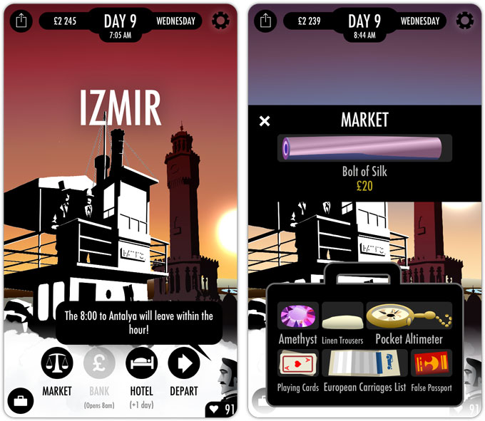 Жанр: Текстовый квестРазработчик/Издатель: inkleВерсия: 1.1 Игры в данной подборке расположены в алфавитном порядке, а потому нельзя сказать, что 80 Days заняла первое место — это просто стечение обстоятельств. Тем не менее, игра по мотивам романа великого французского писателя Жюля Верна получилась крайне интересной и весьма необычной в современных реалиях. Это весьма продвинутый текстовый квест. Следовательно, игрокам придется много и внимательно читать, а также принимать решения, чтобы во что бы то ни стало совершить путешествие вокруг света за 80 дней.