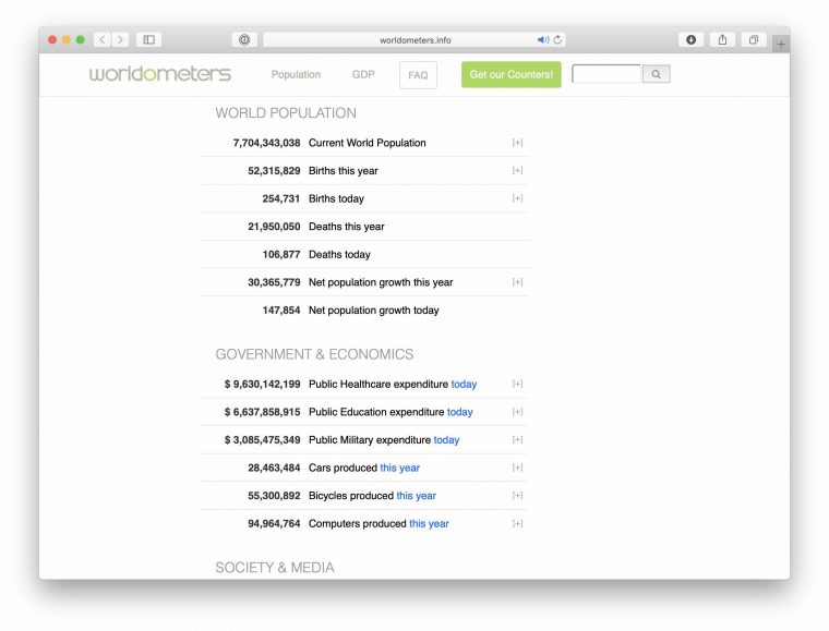 На сайте Worldometers публикуется мировая статистика по самым разным направлениям. Все цифры приблизительные, которые формируются на основе статистики от крупнейших организаций. В числе источников Worldometers есть Организация Объединенных Наций, Всемирная организация здравоохранения, Международный валютный фонд и Всемирный банк.
