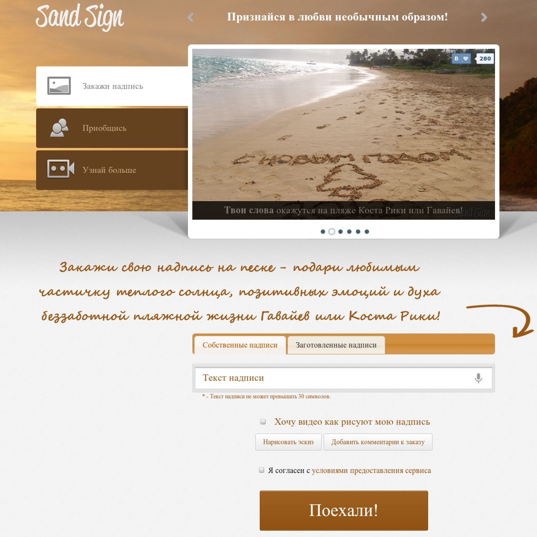 Заказать надпись можно прямо на сайте. Пишете нужный текст, заполняете форму и платите через "Робокассу" или "Единую кассу". Практически интернет-магазин песчаных надписей.