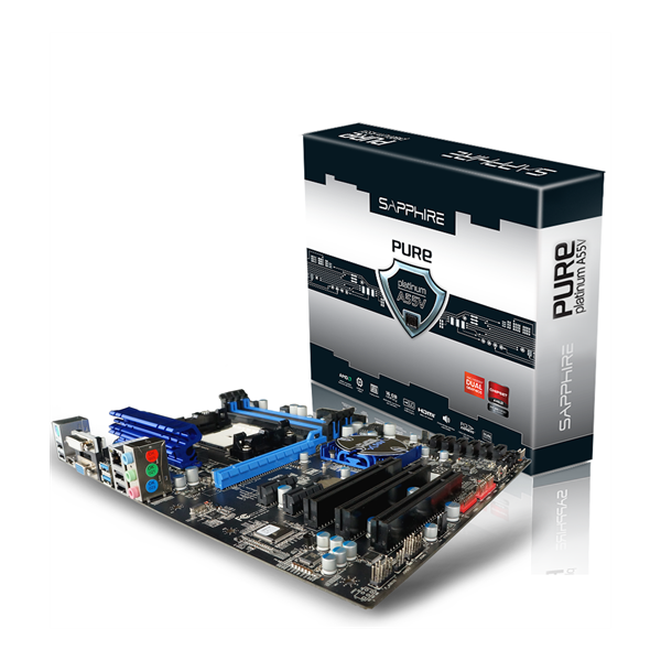 В число слотов расширения входит один PCI-Express 2.0 x16 под дискретную видеокарту и пара PCI-Express x1 плюс три слота PCI. Кроме того, в состав Sapphire Pure Platinum A55V включены шесть портов SATA с пропускной способностью 3 Гбит/с и поддержкой режимов RAID 0/1/10, а также видеовыходы HDMI, Single Link DVI и D-Sub. Поддерживается и технология AMD Dual Graphics, позволяющая объединять усилия интегрированной и дискретной графики для увеличения производительности.