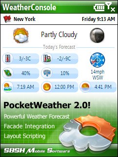 Компания SBSH Mobile Software объявила о выпуске приложения PocketWeather 2.0 для смартфонов под управлением операционной системы Windows Mobile. Напомним, ранее эта программа поддерживалась только коммуникаторами на основе Windows Mobile (т. е. платформами Pocket PC и Professional). PocketWeather позволяет просматривать прогноз погоды непосредственно на экране смартфона Home. Предоставляется информация о температуре, влажности, скорости ветра, облачности, времени восхода и заката и даже возможных землетрясениях. Можно настроить различный внешний вид отображаемого прогноза погоды. Кроме того, PocketWeather 2.0 для WM-смартфонов предусматривает интеграцию с SBSH Facade (пиктограммы прогноза погоды будут отображаться напротив записи каждого числа). SBSH PocketWeather 2.0 работает на смартфонах под управлением Windows Mobile 5 Smartphone и Windows Mobile 6 Standard. Стоимость приложения составляет $12,95. Демо-версию программы, как обычно, вскоре можно будет найти в разделе "Программы для КПК" на HPC.ru.