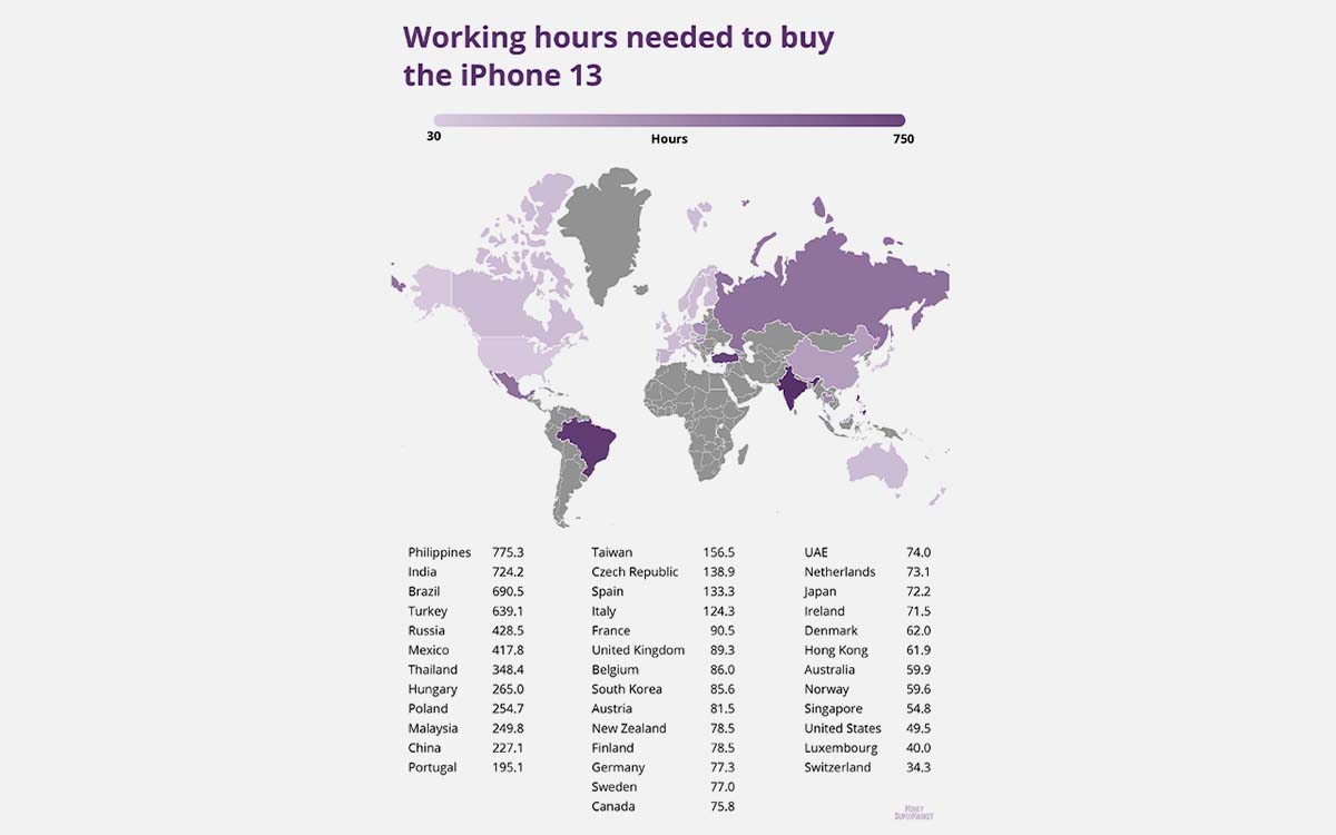 А вот среднестатистическому американцу необходимо потратить всего 6 дней и новенький iPhone 13 будет уже в его кармане. Лучшего всего дела обстоят в Швейцарии. Чтобы заработать на iPhone 13, местному жителю нужно лишь 4 дня. [9to5Mac]