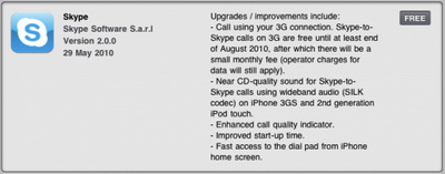 В прошлую субботу компания Skype официально выпустила очередную версию программы Skype для смартфона iPhone. Как говорится в пресс-релизе, версия 2.0 позволяет пользователям iPhone совершать VoIP-звонки в мобильных сетях третьего поколения 3G оператора мобильной связи AT&T. Данная услуга пока бесплатна, по крайней мере, до конца августа этого года, но после этого Skype начнет взимать небольшую плату за ее использование. Информации о размере абонентской платы, а также о других функциональных возможностях Skype for iPhone 2.0 пока нет. Однако разработчики утверждают, что на iPhone 3GS и iPod Touch второго поколения данная версия может обеспечить качество видео на уровне CD. Кстати, пользовательский интерфейс у Skype for iPhone 2.0 также претерпел некоторые изменения.