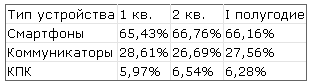 Группа SmartMarketing объявила итоги исследования российского рынка беспроводных информационных устройств WID (Wireless Information Devices) за 1 полугодие 2007 года. Согласно терминологии SmartMarketing в данную категорию входят смартфоны, коммуникаторы и КПК. За этот период общий объем продаж на российском рынке WID составил 990 тыс. штук, это рост на 266,1% относительно показателей 1 полугодия 2006 г., когда было продано 372 тыс. штук. Как главное событие рассматривается схватка между компанией HTC, отстаивающей свои лидерские позиции в секторе Windows Mobile. В течение первого полугодия доля рынка марки HTC продолжала демонстрировать негативный тренд, несмотря на появление ряда эксклюзивных моделей. Активность марки glofiish создает ощутимый прессинг также и для других игроков данного сегмента, отмечают аналитики. Начиная с начала 2006 г. SmartMarketing ведет раздельный учет в трех сегментах: смартфоны, коммуникаторы и карманные компьютеры. Соотношение долей этих устройств по итогам 2007 г. составило 66,2% (смартфоны), 27,6% (коммуникаторы) и 6,3% (КПК), соответственно. Стоит отметить, что динамика развития рынка за первое полугодие текущего года демонстрирует дальнейшее падение сегмента КПК (6,3% в 1 полугодии 2007 г. и 9,00% во 2 полугодии 2006 г.). Положительный тренд в сегменте смартфонов(65,4% в 1 квартале 2007 г. — 66,8% во 2 квартале 2007 г.) и рост их доли относительно коммуникаторов (28,6% в 1 квартале 2007 г. — 26,7% во 2 квартале 2007 г.) обуславливается действиями компании Nokia, однако также следует отметить и возрастающую активность компании Sony Ericsson в данном секторе. Динамика изменения товарной структуры рынка обусловила также изменение расстановки сил в разрезе платформ. В целом, платформная структура рынка выглядела в 2007 г. следующим образом: 62,4% - Symbian OS, 37,6% - Windows Mobile, 0,1% - Palm OS, 0% - другие платформы (в частности, Linux). Пять крупнейших производителей устройств на базе платформы Windows Mobile: - HTC (31,8% по итогам полугодия) - E-Ten Information Systems (11,1% по итогам полугодия) - Samsung (8,2% по итогам полугодия) - Rover (7,6% по итогам полугодия) - HP (6% по итогам полугодия)