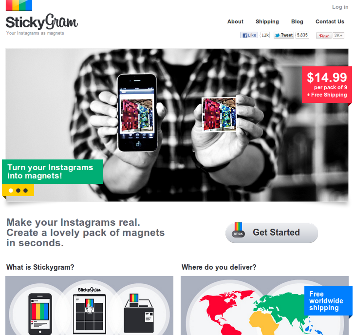 Сайт StickyGram - это принтсервис, который принимает изображения только с Instagram, а печатает их только на магнитиках для холодильников, и только партиями по девять штук. Соответственно, и цена заказа всегда одинаковая - четырнадцать долларов и девяносто девять центов. Обещают бесплатную доставку по всему миру. Проверено, доходит даже в Россию.