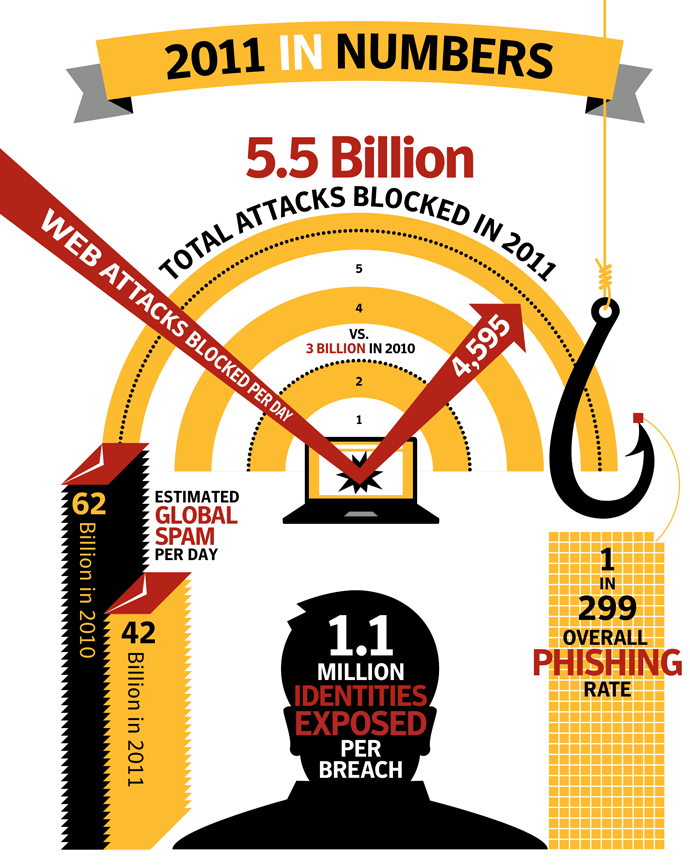 В 2011 году Symantec отразил более 5,5 миллиардов атак, что на 81% больше, чем в предыдущем. Кроме того, число уникальных образцов вредоносного кода в мире увеличилось до 403 миллионов, доля ежедневных веб-атак выросла на 36%. В то же время значительно снизился уровень спама, и на 20% снизилось количество новых уязвимостей. Эта глобальная статистика на фоне продолжающегося роста рынка вредоносного ПО выявляет интересную тенденцию. Злоумышленники стали использовать простые инструментарии для существующих уязвимостей. Все чаще киберпреступники нацеливаются на социальные сети, предпочитая их спаму. Сама природа таких сетей формирует ошибочное мнение о безопасности пользователей, и злоумышленники видят в них новых жертв. Технологии социальной инженерии и вирусная природа социальных сетей позволяют угрозам распространяться с огромной скоростью.