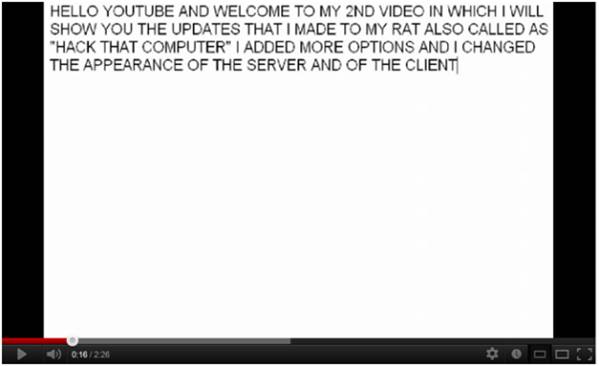 В одном из видеороликов злоумышленник заявляет на весь мир о своих целях и намерениях. «Привет YouTube! Приглашаю посмотреть мое второе видео «Взломай Этот Компьютер», где я покажу вам мой обновленный RAT, с новыми функциями и измененными видом сервера и клиента», - говорится в видео. «Как я подлавливаю людей при помощи моего RAT. Вызывает сердечные приступы, замешательство и многое другое. Первым делом я сделал так, чтобы компьютер этого парня начинал издавать крик. Он быстро закрывает программу, но я запускаю ее снова. Он делает все что может, чтобы остановить это (бьется как рыба об лед и бьет по компьютеру, потому что, как я думаю, другие люди были дома). Наслаждайтесь этим видео!», - комментирует автор атаки свой ролик.
