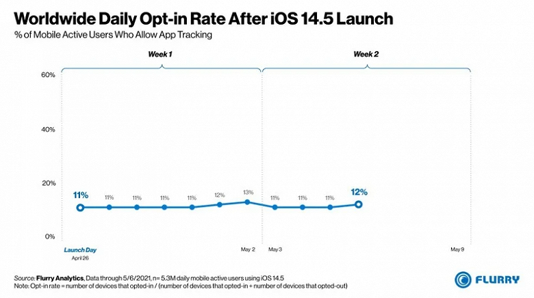 Аналитическая компания Flurry опубликовала интересную статистику — сколько пользователей согласились разрешить слежку со стороны приложений в iOS 14.5.