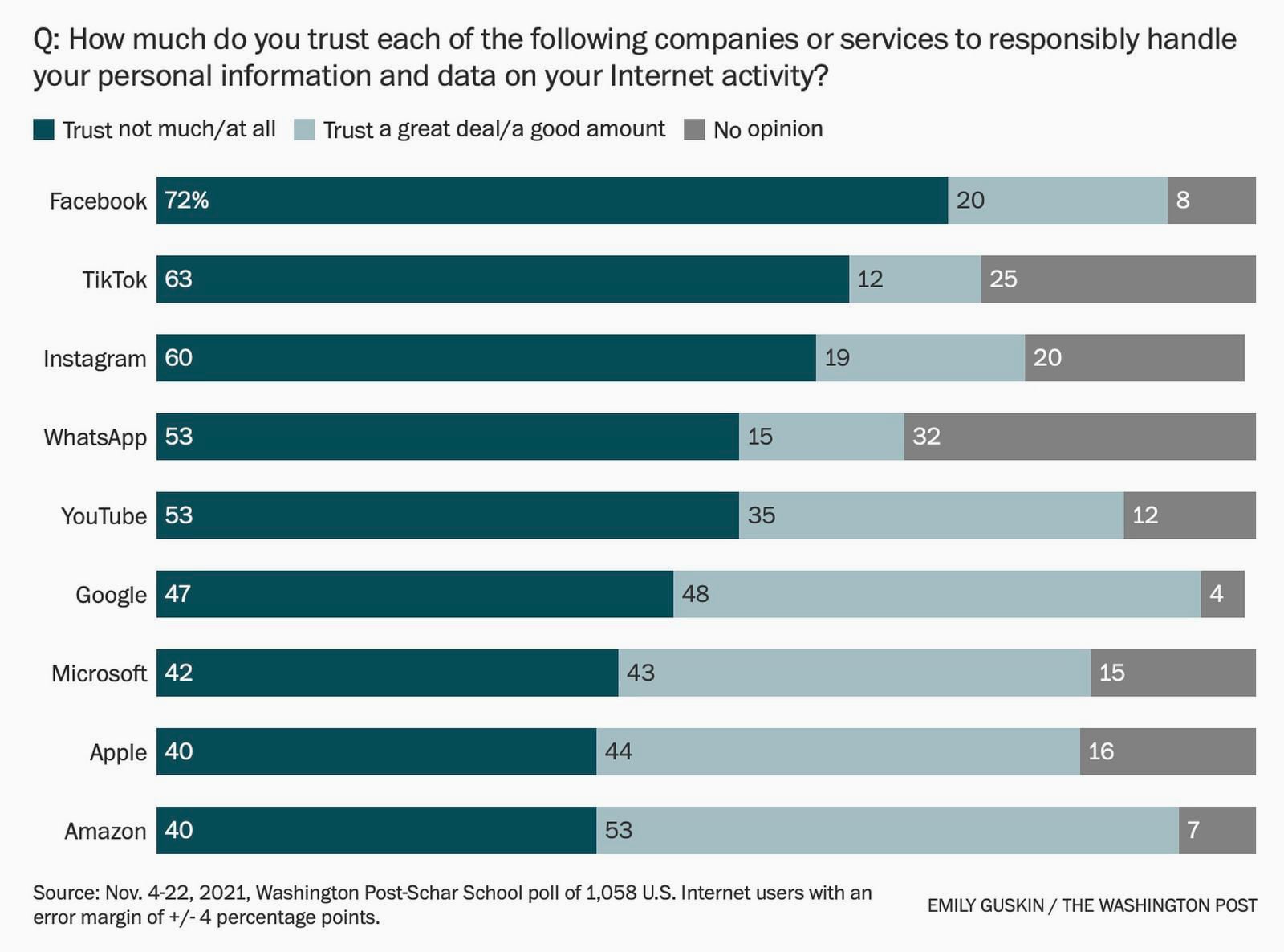 Согласно опросу издания The Washington Post, в котором приняли участие более 1000 американцев, большинство пользователей не доверяют свои конфиденциальные данные Facebook (72%), TikTok (63%) и Instagram (60%).