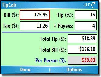 Разработчик программного обеспечения ScaryBear Software обновил версию программы TipCalc для Windows Mobile смартфонов. Эта программка предназначена для расчета чаевых, и может оказаться подспорьем для тех, кто часто обедает вне дома. Чаевые можно рассчитать в зависимости от суммы, устанавливая различные проценты, и в зависимости от количества человек, складывающихся на оплату счёта. Таким образом можно определить общую сумму вместе с чаевыми, и какую именно сумму необходимо внести каждому участнику обеда или вечеринки. Программа работает со смартфонами под управлением операционных систем SmartPhone 2002, Windows Mobile 2003 и 5.0 SmartPhone с различными разрешениями дисплеев. Стоимость полной редакции программы составляет $4,95. В новой версии TipCalc 1.2 была решена проблема с вводом кода активации на небольших дисплеях смартфонов. Как обычно, в ближайшее, демо-версию TipCalc 1.2 время можно будет найти в разделе "Программы на HPC.ru".