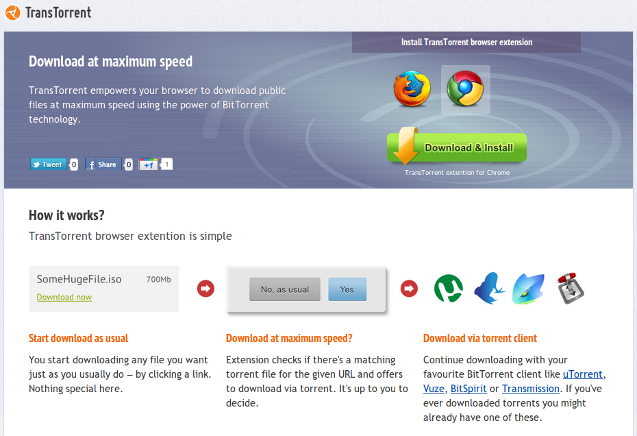 TransTorrent - это довольно простой сайт, там только пара браузерных расширений и описание интересной идеи. Идея такая: если вы собираетесь скачать с сервера файл, а для этого файла в сети есть торрент, то почему бы им не воспользоваться, ведь торренты часто удобнее обычной закачки с централизованного сервера?