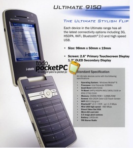 Ultimate 9150 - это последний из 5 продуктов серии Ultimate, которая была представлена компанией i-mate на Всемирном Конгрессе 3GSM 2007 в Барселоне. Данное устройство выполнено в форм-факторе "раскладушка". Размеры этого коммуникатора составляют 98х50х19 мм. Характеристики Ultimate 9150, согласно данным сайта Todo Pocket PC, выглядят следующим образом: - внешний дисплей с диагональю 1,2 дюйма - главный сенсорный дисплей с разрешением VGA, поддержкой 262К цветов и размером диагонали 2,6 дюйма - операционная система Windows Mobile 6 - процессор Intel Bulverde с тактовой частотой 520 МГц - 256Мб ROM - 128Мб RAM - слот расширения для карт памяти формата microSD - беспроводные сети Wi-Fi 802.11b/g/e/i - Bluetooth версии 2.0 + EDR - miniUSB - 2-Мп камера - Cтерео FM-радио - аккумулятор емкостью 1400 мАч. Ultimate 9150 работает в сотовых сетях GSM/GPRS 850/900/1800/1900 МГц с поддержкой EDGE, а также поддерживает стандарты связи 3 поколения UMTS/HSDPA 850/1900/2100 МГц или 850/1700/2100 МГц.