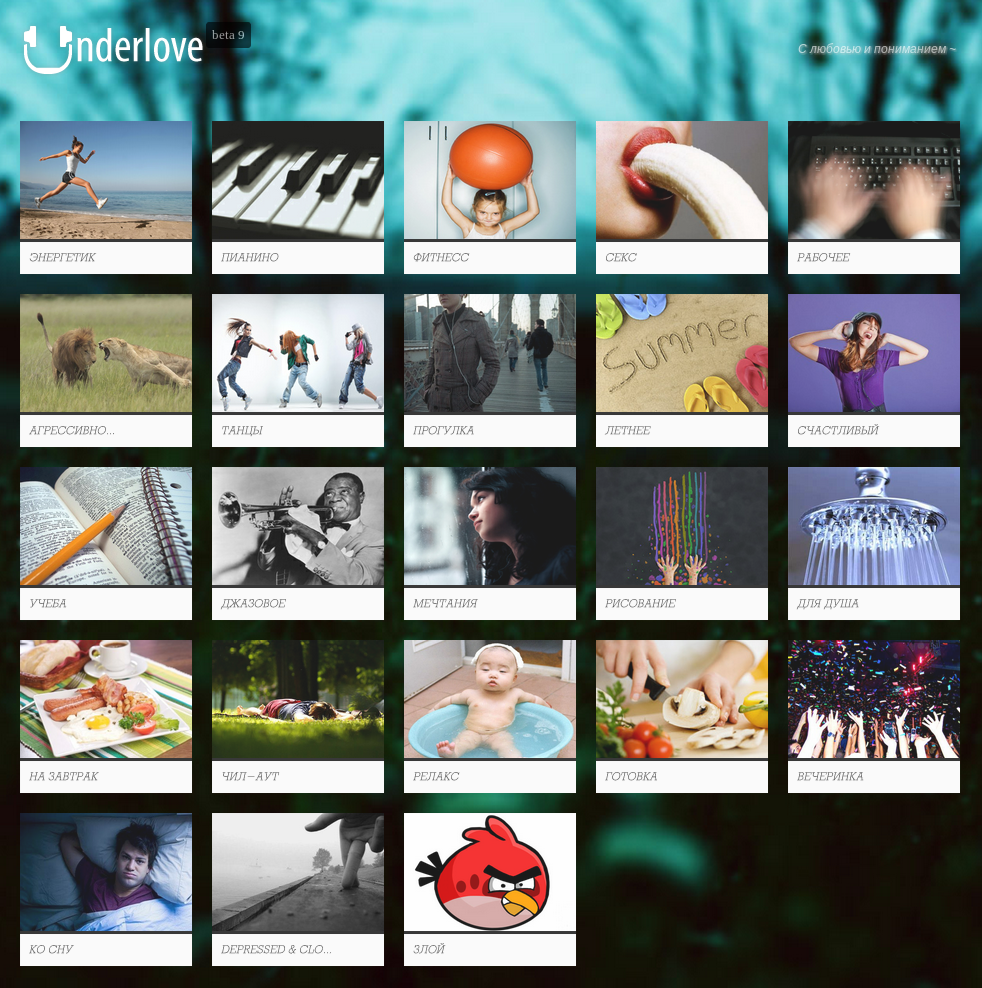 Логично предположить, что человек заходит на музыкальный сайт с одной основной целью - послушать музыку. Все эти поиски правильной музыки, составление социальных подборок, каталоги радиостанций и музыкальные энциклопедии - это круто, но насколько удобнее было бы просто зайти на сайт, нажать кнопку "Играть музыку" и получать удовольствие. Конечно, в разных ситуациях нужна разная музыка, так что кнопок должно быть много. Впрочем, типичных ситуаций, в которых нужна определённая музыка, не так много, как кажется. На сайте Underlove их двадцать три, хотя наверное со временем будет больше.