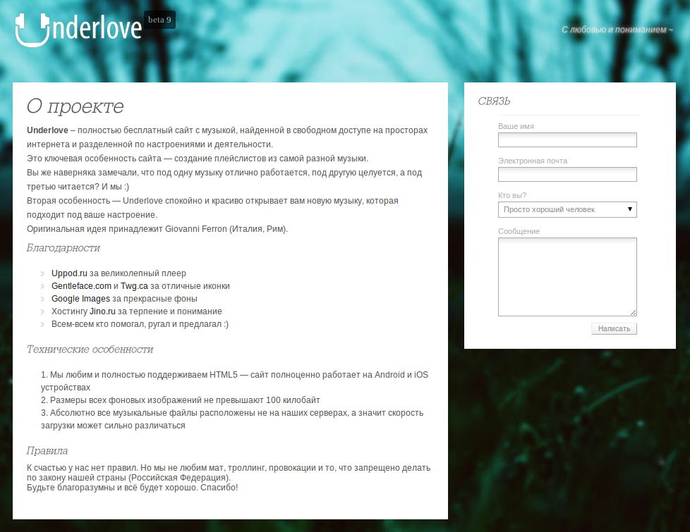Разработчики Underlove постарались сделать интерфейс сайта максимально уютным. Эту проблему они тоже решили максимально олдскульными методами - они просто не стали делать ничего, что не знали, как сделать уютно. По большому счёту, на Underlove практически ничего и нет. Только музыка, комментарии через ВКонтакте, обратная связь через Reformal и фоновые изображения, подбираемые не менее тщательно, чем состав музыкальных подборок. Всё остальное убралось на одной странице: