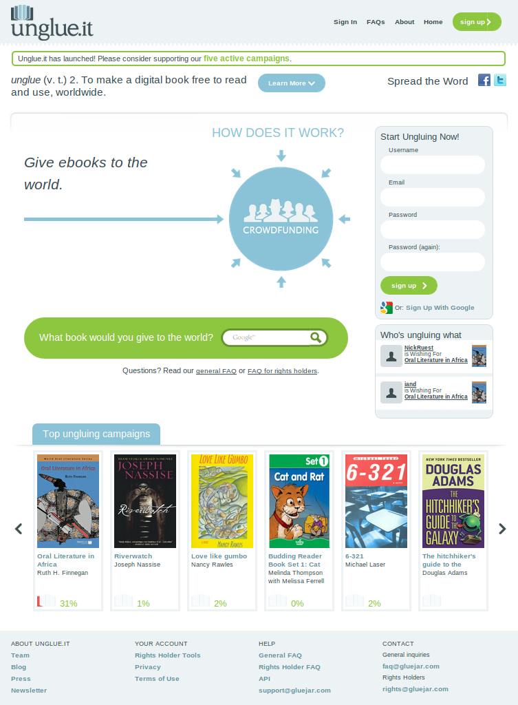 Схема работы сайта Unglue.it очень простая и понятная. Пользователи регистрируются на сайте и сообщают, какие книги они хотели бы видеть выпущенными под лицензией Creative Commons (в народе - "копилефт"). Команда сайта связывается с авторами наиболее востребованных книг (или с их наследниками и прочими правообладателями) и проводит переговоры банально выясняя, за какую разовую сумму они готовы "освободить" свои бессмертные творения. Сумма публикуется на сайте и начинается сбор средств примерно по той же схеме, что и на Kickstarter. Если сумму удаётся собрать, то команда Unglue.it улаживает формальности и книга становится доступной для совершенно легального скачивания. Сайт удерживает процент за труды, так что им вряд ли надоест вся эта рутина.