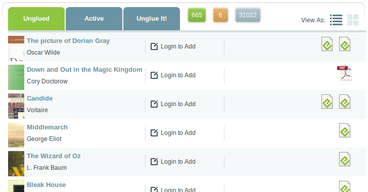 В настоящий момент на сайте Unglue.it "заказано" 31022 книги. На вершине списка только признанная классика англоязычной литературы: