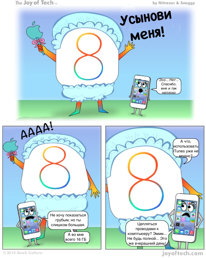 Новая операционная система вышла настолько объёмной и массивной, что обновить старые девайсы, имеющие 16ГБ на борту, стало практически невозможным. Слишком уж много места ей требуется. По этому поводу ребята из Joy of Tech сделали комикс, в свойственном им стиле.