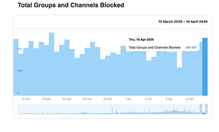 Команда популярного мессенджера Telegram 16 апреля 2026 года заблокировала 104,437 тыс. каналов и групп, нарушающих политику мессенджера. Об этом свидетельствуют обновленные данные на сайте сервиса.