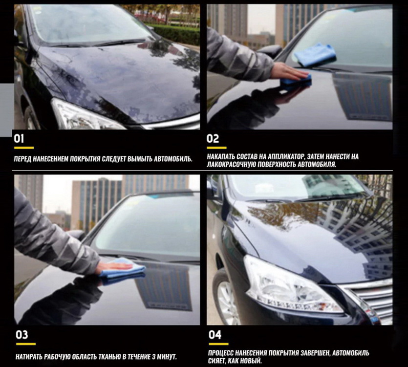 ВАЖНО: перед нанесением необходимо тщательно подготовить поверхность — помыть автомобиль с шампунем и отполировать без применения дополнительных средств, а затем высушить.
