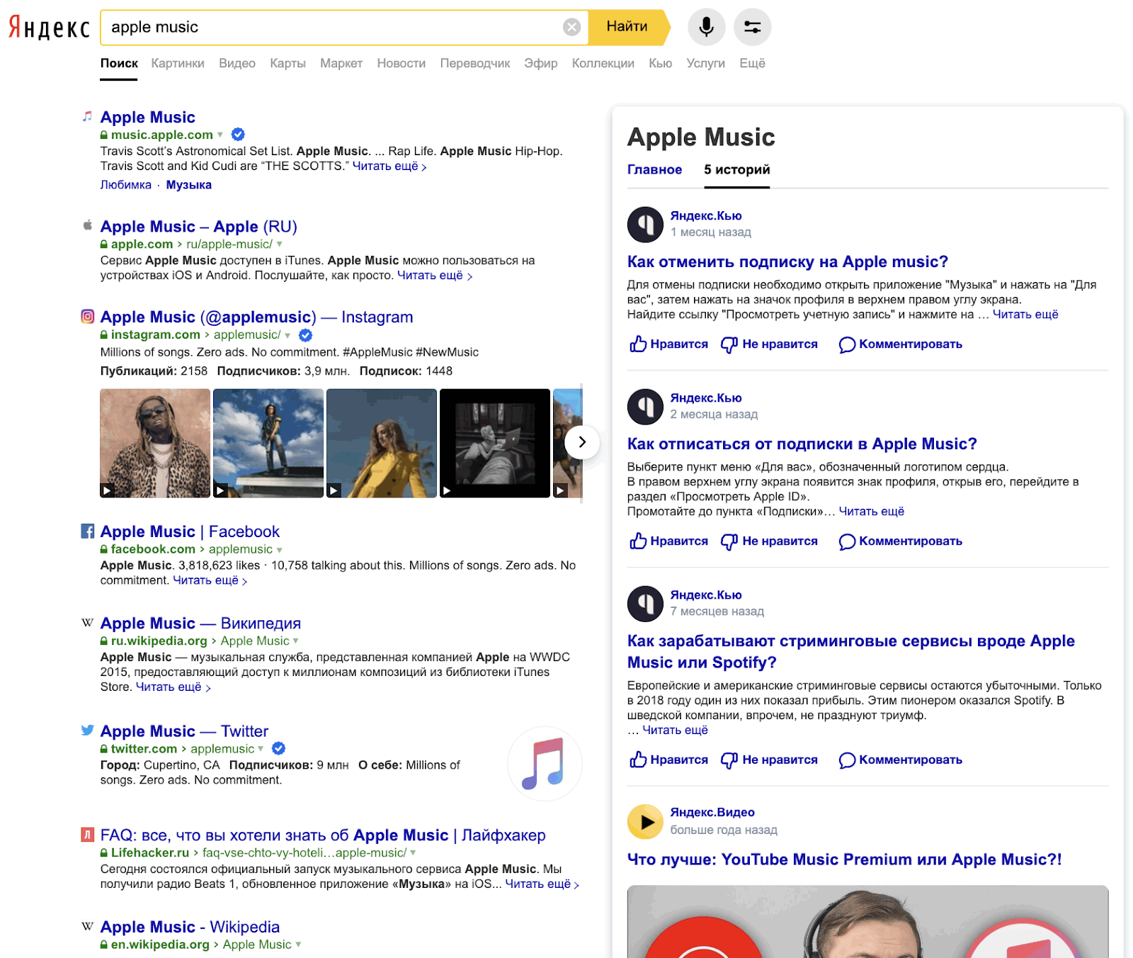 По запросу [apple music] поиск показывает ответы на вопросы об этом сервисе с Яндекс.Кью