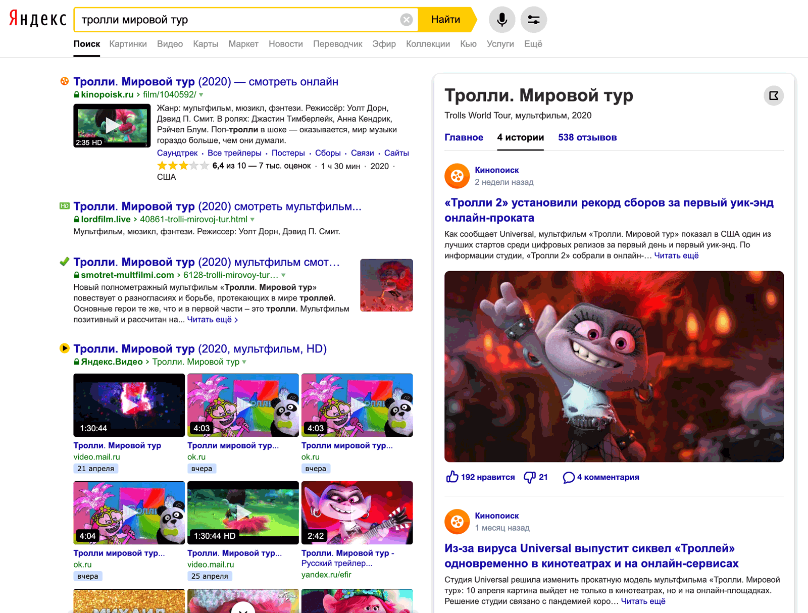 Результаты поиска по запросам о фильме «Тролли. Мировой тур» содержат новости проката и отзывы зрителей