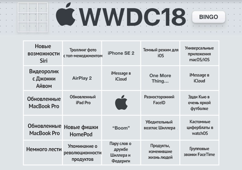 Один из пользователей Reddit решил составить собственную «карту желаний» предстоящей конференции. Оригинал можете найти по ссылке. Мы же выполнили перевод WWDC 2018 в карточках.
