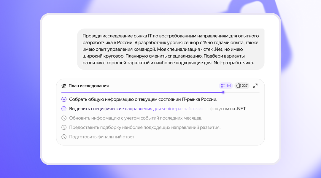Иллюстрация: ЯндексКак пояснили разработчики, ИИ-агент «Исследовать» сокращает время на сбор и анализ информации. Можно задать вопрос, и нейросеть самостоятельно разработает план исследования, уточнит детали и предоставит структурированный разбор темы. При необходимости ИИ-агент может написать и запустить код для анализа данных.