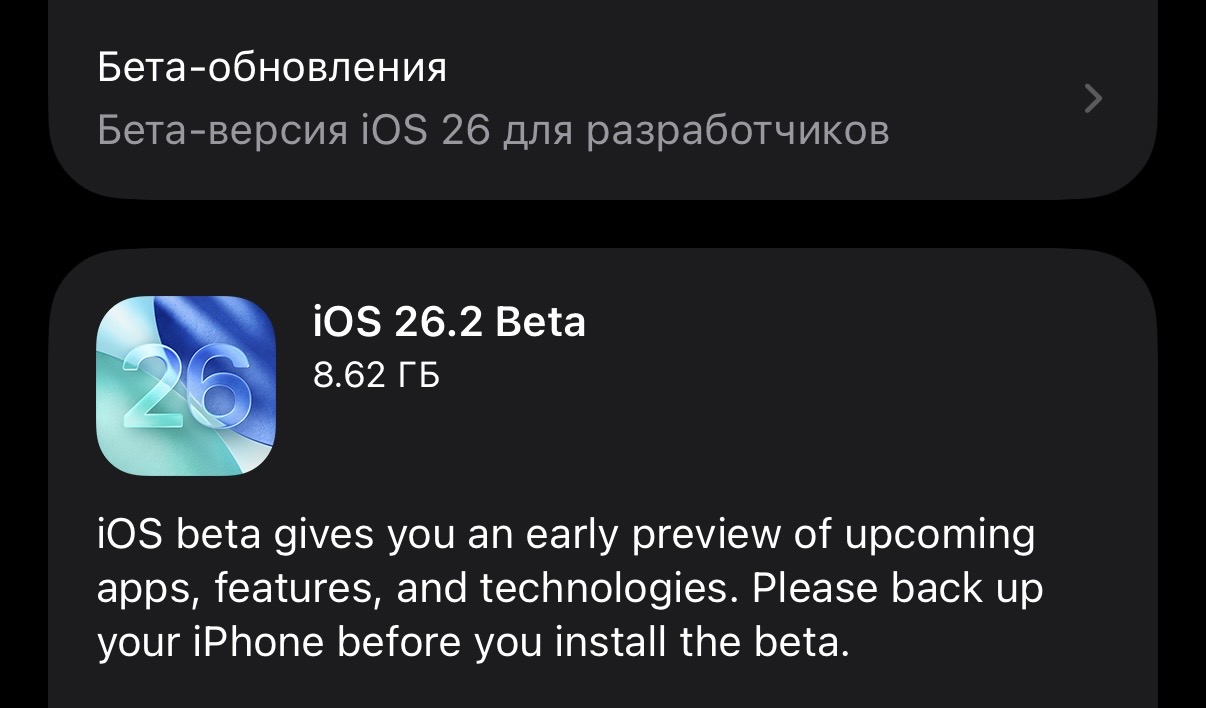 Скачать iOS 26.2 beta 1 можно уже сейчас «по воздуху».