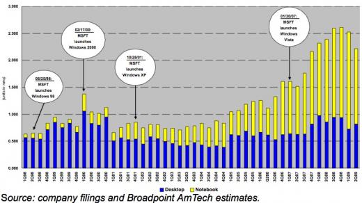 Аналитики утверждают, что заявленный на следующей неделе выход Windows 7 будет способствовать увеличению продаж Apple Mac. Brian Marshall из компании Broadpoint AmTech утверждает, что в течение последних 10 лет каждый релиз Windows совпадал с увеличением продаж Apple Mac. Этот эффект был особенно заметен с выходом Vista, продажи Mac выросли осенью 2007 года. Часть пользователей Windows XP вместо перехода на Vista приняли решение перейти на Mac. На графике показано влияние выходов новых версий Windows за последние 10 лет на продажи Mac. Выделены четыре основных версии: Windows 98 (25 июня 1998), Windows 2000 (17 февраля 2000), Windows XP (25 октября 2001) и Windows Vista (30 января 2007). Windows 7 считается достаточно надежным обновлением от Microsoft. И ранний выпуск тестовой версии был, в том числе, нацелен на снижение эффекта, аналогичного эффекту, полученному от выпуска Vista. Но аналитик предсказывает увеличение доли Apple на мировом компьютерном рынке в два раза, с текущих 4% до 8% к 2013 г. В том числе, по причине выхода Windows 7.