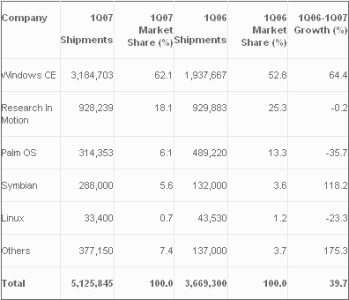 Как сообщила аналитическая компания Gartner, в первом квартале 2007 года заметно выросли поставки PDA (personal digital assistant) на базе операционной системы Windows Mobile существенно выросли. Продажи Windows Mobile выросли на 64% по сравнению с предыдущим кварталом и на 39,7% по сравнению с аналогичным периодом прошлого года. Это заметно поспособствовало росту рынка PDA, который достиг в объёме 5,1 млн. устройств. Лицензиаты Microsoft осуществили поставки Windows Mobile устройств объёмом 3,1 млн. шт., что составляет более 60% рынка PDA. Для аналитиков такой рост оказался сюрпризом, поскольку выпуск новой операционной системы Windows Mobile 6, а также новых моделей под неё ожидался во втором квартале. Было бы нормально, если бы потребители и компании ограничили свои закупки в условиях, когда последующие апгрейды неминуемы. Среди поставщиков PDA лидером является компания Research In Motion, при чём среди её продукции доминируют смартфоны, а не PDA - почти 55% продаж составил новый смартфон BlackBerry Pearl. Компания Mio Technology является лидером по продаже PDA среди лицензиатов Microsoft. Samsung, Sharp и Nokia завершают пятёрку лидеров по продаже PDA в мире. Надо отметить, что классификация у Gartner не слишком привычная, под PDA она понимает портативное устройство с открытой OS, поддерживающей приложения сторонних разработчиков, заточенное преимущественно под работу с данными. У него могут быть возможности телефона, но эта функциональность второстепенна. Так, например, в разряд PDA компания включает модели с возможностью сотовой связи, такие как BlackBerry 87xx, но не учитывает "смартфоны", в том числе Treo 750 и BlackBerry 81xx.