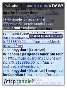 Разработчик программного обеспечения Mobileways представил версию приложения WirelessIRC для смартфонов, работающих под управлением платформы S60 3rd Edition. Программа позволяет подсоединяться к IRC-сетям (Internet Relay Chat ) и общаться в привычном формате чата. Также поддерживается общение по локальным WLAN через протокол Bonjour. Для каждого канала можно выделить отдельное окно чата, дополнительно в нём будет выводиться дополнительная информация. Предусмотрена функция автозапонения для команд, каналов и имён, что ускоряет процесс общения. Программа также способна автоматически захватывать URL, копировать и вставлять их или отправлять на аккаунт в сервисе del.icio.us. WirelessIRC требует подключения к интернету через WLAN или по сотовым сетям (GPRS, UMTS, CSD, ...). Для подсоединения производится автоматическое сканирование в поиске точек доступа WLAN. Поддерживаются кодировки цветов IRC и форматирование текста. Поддерживается также безопасное соединение по SSL. Стоимость полной редакции программы составляет $19,95. Как обычно, в ближайшее время, демо версию WirelessIRC 1.01 можно будет найти в разделе "Программы для КПК" на HPC.ru.